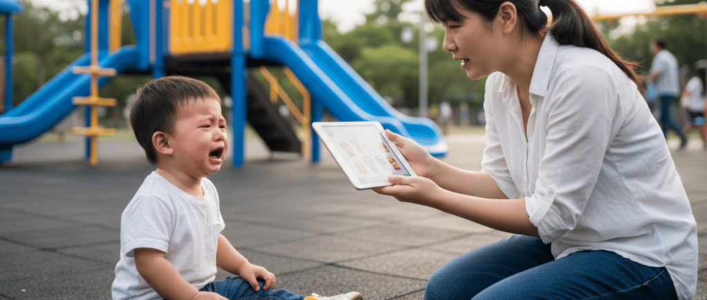 At the hawker centre, they’re screaming because you ordered chicken rice instead of noodles. And you’re squatting down explaining why we can’t waste food and other people are eating… but their brain is in full meltdown mode. They literally cannot hear you.