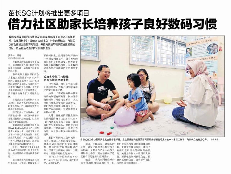 At the launch of the nationwide Grow Well SG initiative, Minister of State Rahayu Mahzam highlighted the need for stronger digital-parenting support for families across Singapore. We are proud that Look Up Family was named as one of the community partners helping parents navigate digital life with confidence, balance and connection.